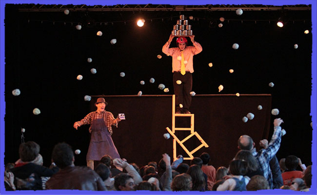 Un spectacle tendre et festif avec : un voyage en mer, un ban de poissons volants, une veillée de mondée au coin du feu où les noix deviennent musicales et acrobatiques, des chaises qui s’envolent, des oiseaux qui s’élèvent au dessus du public, une partie de pêche endiablée avec un poisson acrobate et un chamboule tout digne des plus grandes fêtes foraines à l’ancienne où tous les spectateurs sont invités à participer !