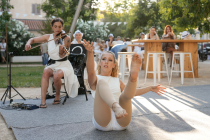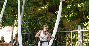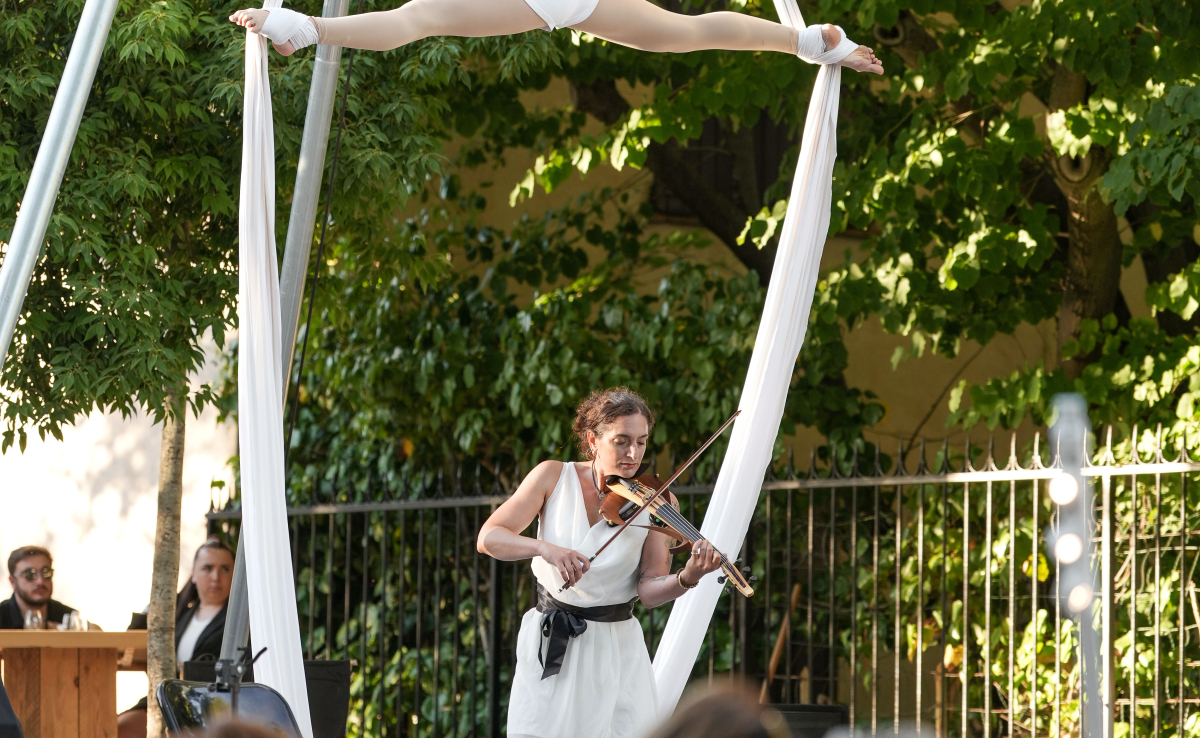 Une prestation suspendue dans les airs, où se dessine une poésie entre la violoniste, et la danseuse qui virevolte dans le ciel.