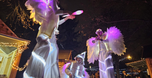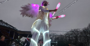 Dans un tourbillon de son et d'éclats "lumières d'Anges" envahit les rues comme un souffle céleste. Au coeur du cortège, des musiciens déambulent, leurs mélodies s'élevant dans les airs ou résonnant depuis un chariot sonorisé revêtant différentes allures. Autour d'eux, les échassiers majestueux s'élèvent au-dessus de la Foule, parés d'ailes d'anges qui ondulent au gré du vent. Leur démarche aérienne semble défier la gravité, tandis que les jongleurs, véritables virtuoses du mouvement, enchaînent figures et lancers, leurs balles et massues scintillants comme des étoiles filantes.
