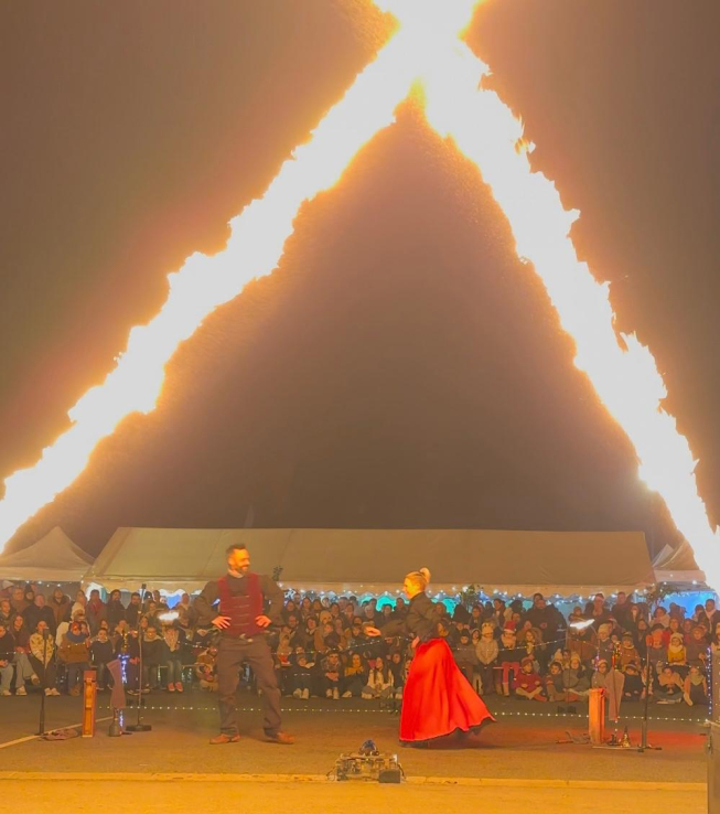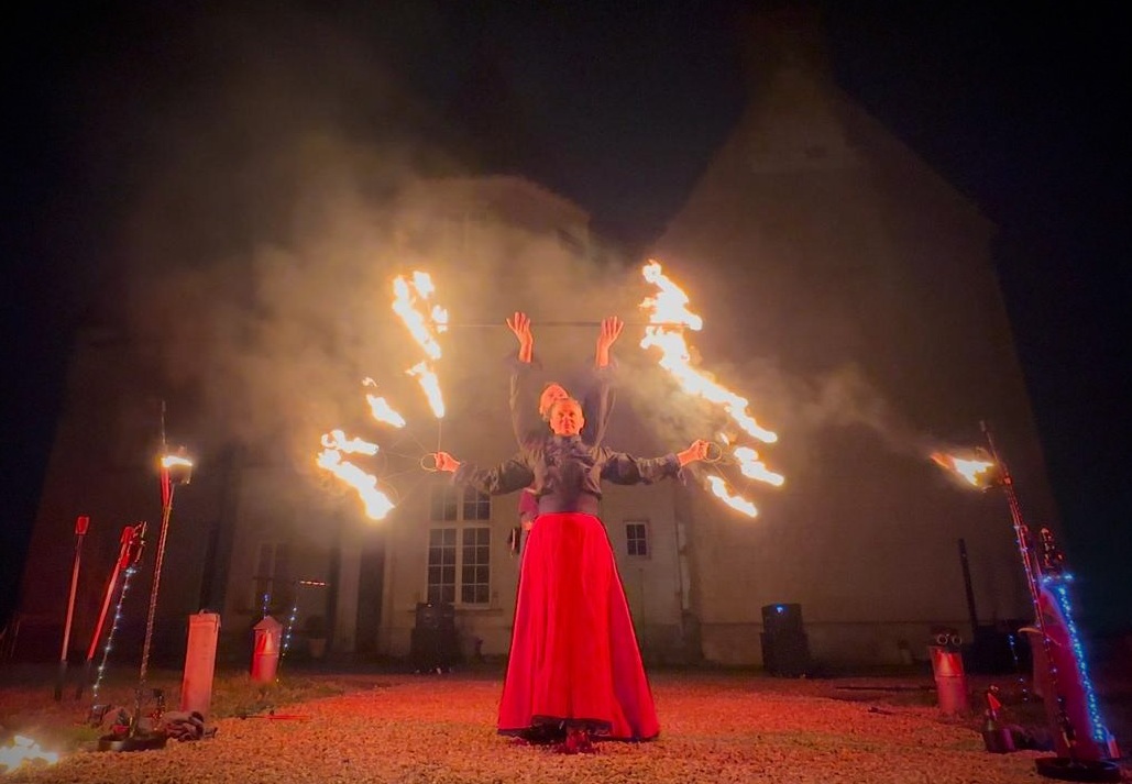 Yule : Spectacle feu et pyrotechnie Lorsque s'allument les lanternes, les tambours retentissent dans la nuit noire... Entrez dans un rituel de magie ancestrale, une lutte de pouvoir entre sorciers et sorcière, un passage vers le monde... Par Faces & Fire Cie