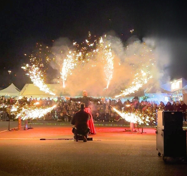 Ce show captivant inclut des numéros de jonglerie enflammée, de souffleur de feu, de fire-eating, de jonglerie pyrotechnique, d'artifices ainsi que des effets scéniques sêctaculaires.