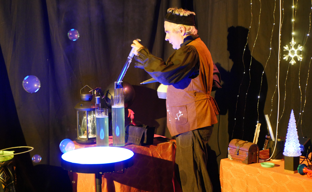 "La vraie magie de noël" est un spectacle de bulles de savon qui raconte l'histoire d'un lutin espiègle qui vient s'occuper des animaux magiques dont le père noël à la charge.