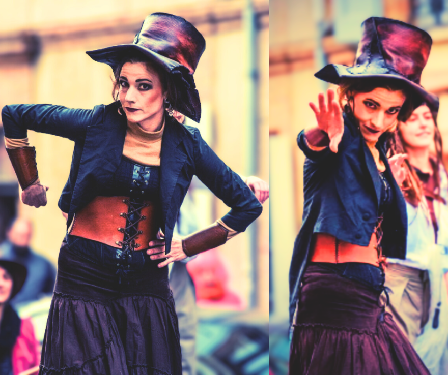 Prestation théâtrale rétro muette à vapeur, un voyage burlesque, extravagant dans l'imaginaire steampunk ! De la délicatesse, de l'élégance, de la fierté dubitative! Moitié prétentieuse moitié taquineuse, tout droit sortie d'une étrange journée romanesque du XIX ème siècle; "Into the past" est un flash back incompréhensible qui saura faire naître des sourires surpris et des intéractions de bonne humeur dignes d'un évènement où l'on s'amuse!
