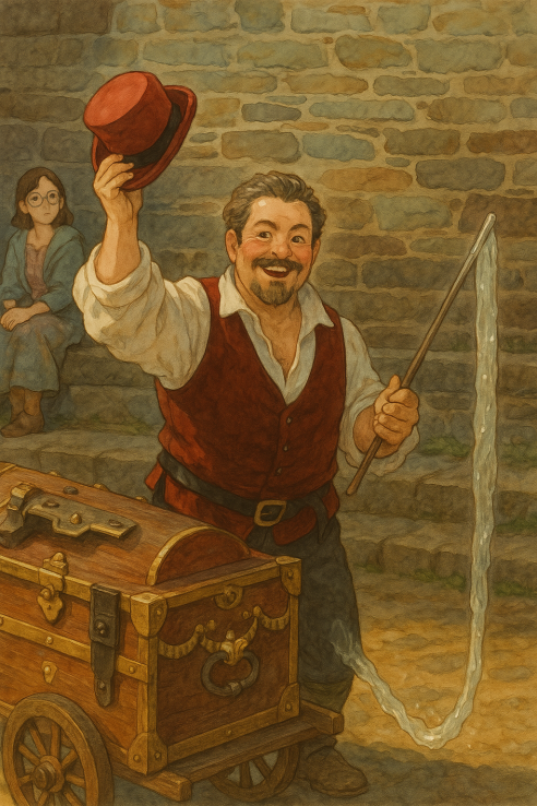 Vitalis, le magicien des bulles, déambule au rythme du vent avec sa roulotte musicale, accompagné de son fidèle complice, Jolie Cœur, un petit singe farceur et attachant.