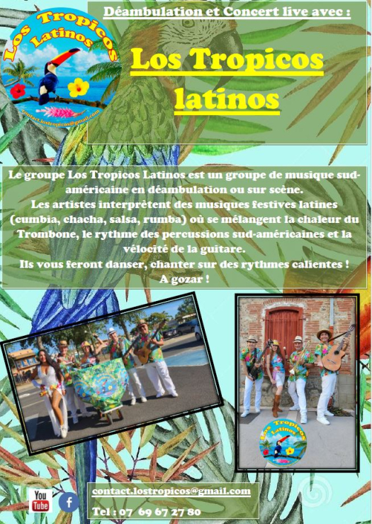 Los Tropicos latinos est un groupe de musique sud-américaine en déambulation ou en concert. Les artistes musiciens-chanteurs interprètent des musiques festives latines (cumbia, chacha, salsa, rumba) où se mélangent la chaleur du Trombone, le rythme des percussions sud-américaines et la vélocité de la guitare. Ils vous feront danser, chanter sur des rythmes calientes ! A gozar !