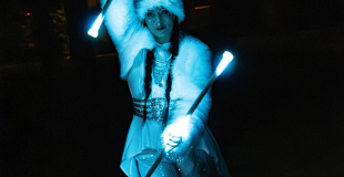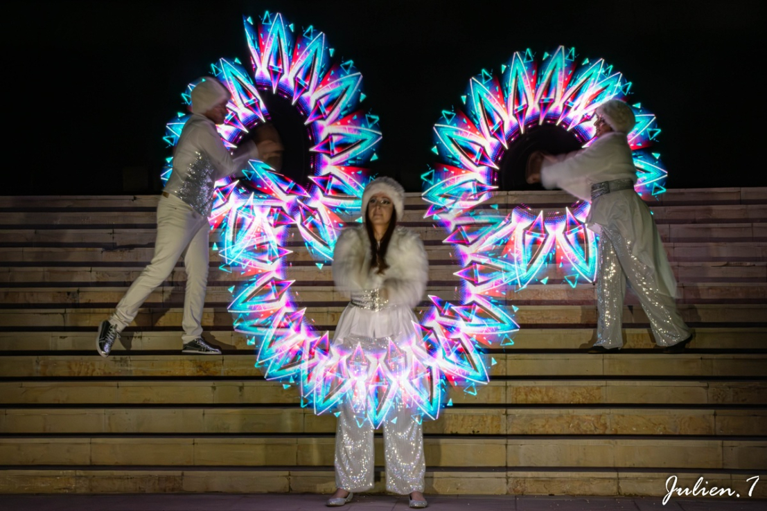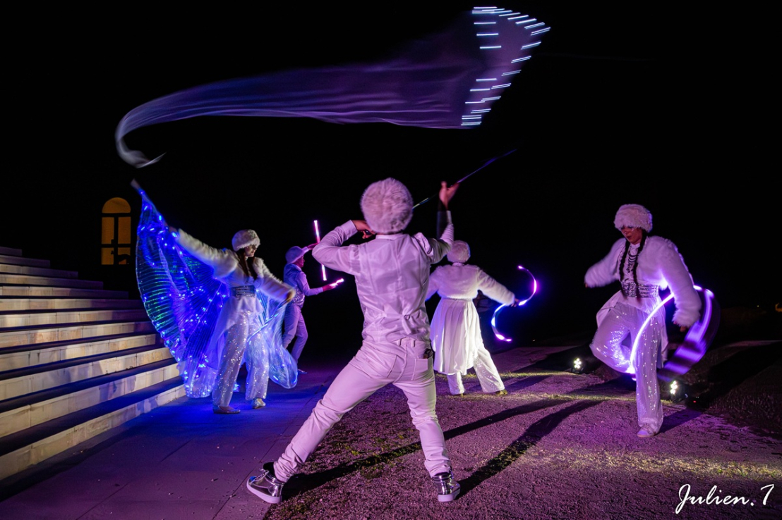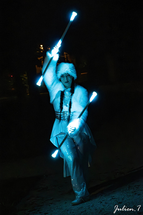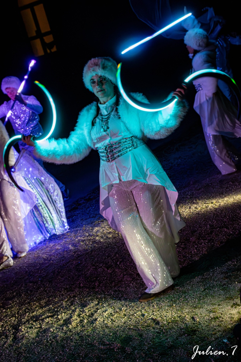 Lors d'une promenade féerique, le jonglage lumineux , se transforme en une célébration éblouissante, évoquant la magie des paysages hivernaux.