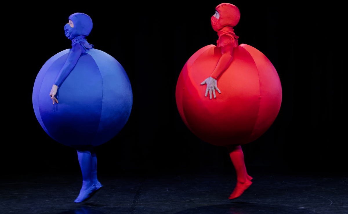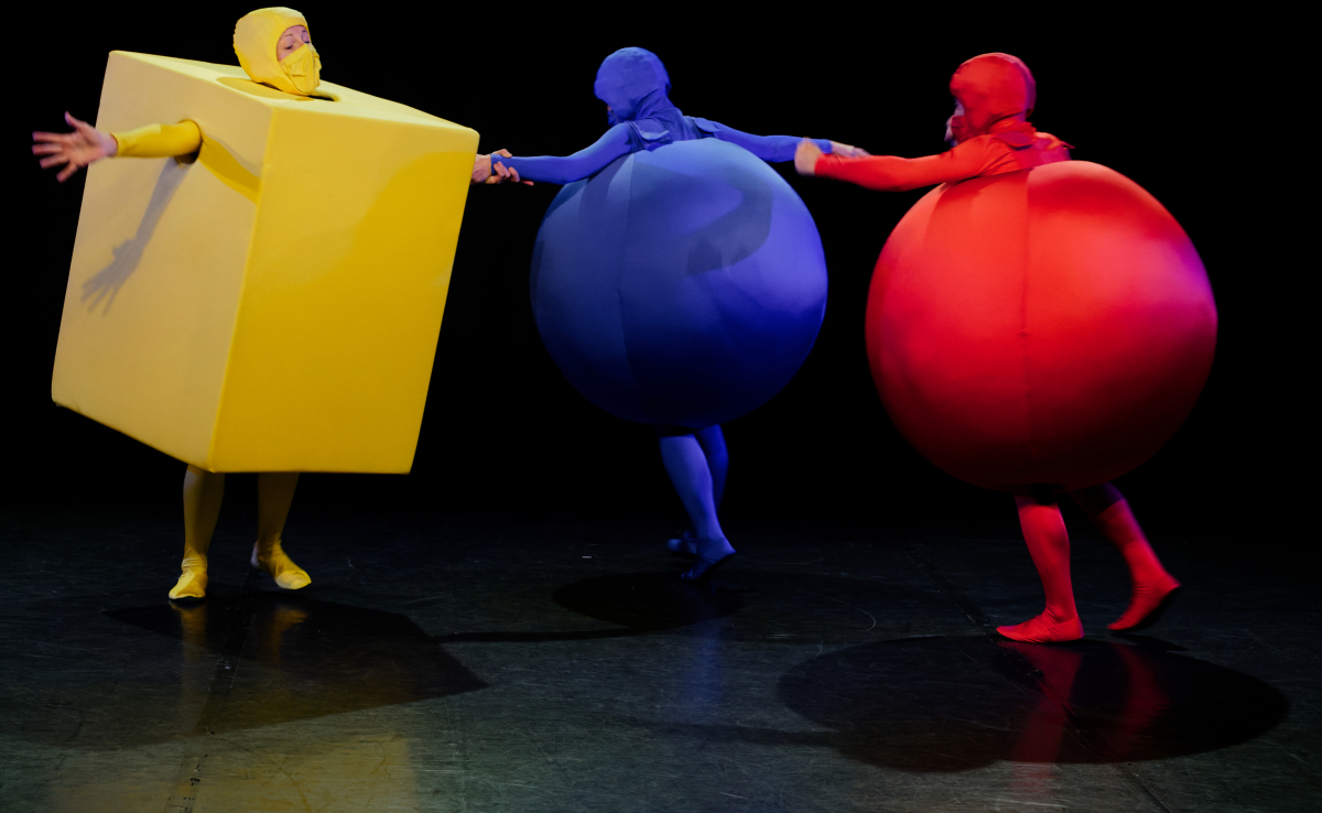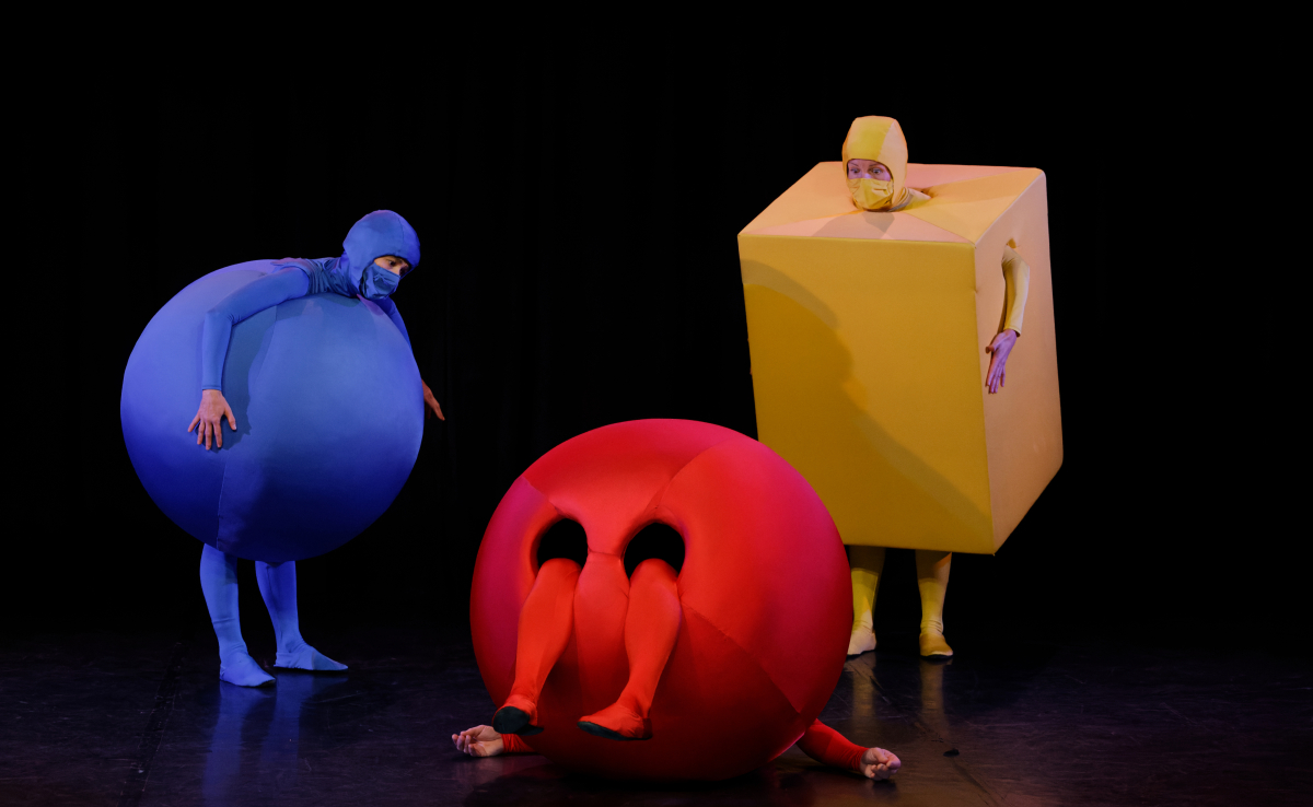 Trois formes colorées de taille humaine apparaissent : une boule rouge, un cube jaune, une boule bleue. Chacune explore à sa manière le monde qui l’entoure. Rouge s’éveille, découvre son corps, Jaune apprend à marcher, Bleu cherche l’autre, hésite, danse, s’approche.