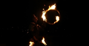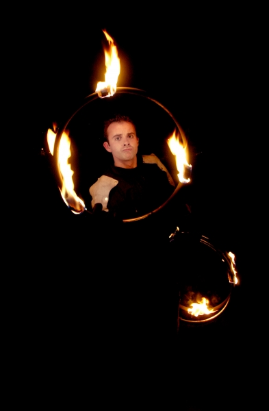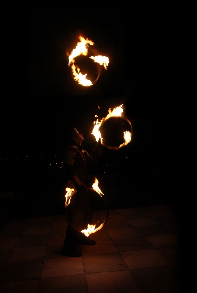 Si les lieux le permettent, j‘enchaine en jonglant avec trois cerceaux en feu.