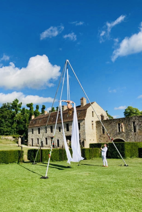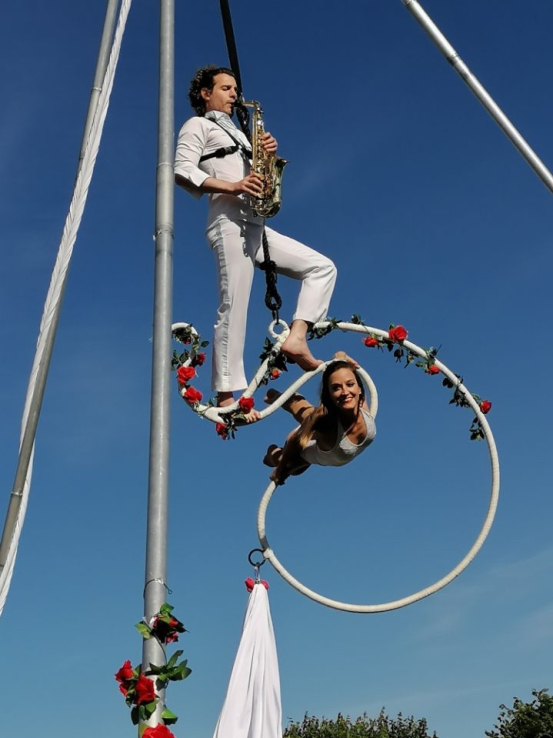 Chaque passage devient une expérience unique, qu’il s’agisse d’un numéro au tissu aérien, d’un cerceau accompagné du saxophone, d’un duo au tissu, ou encore d’un solo de saxophone idéal pour sublimer un cocktail ou un accueil de soirée.