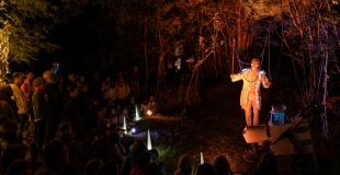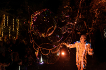 En déambulation ou avec des scènettes fixes, l'artiste créera une ambiance féérique avec ses bulles irisées de toutes tailles éclairées par des lumières multicolores lors de vos manifestations de nuit.