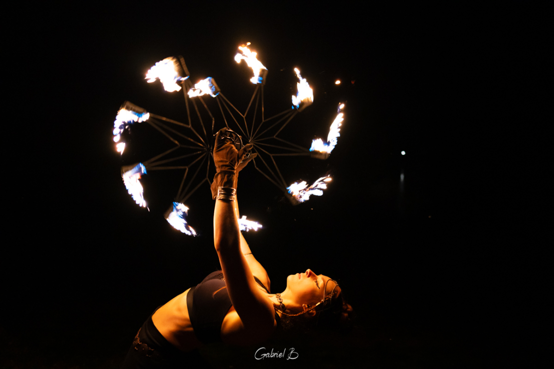 Nous manipulons de nombreux agrès enflammés : mains de feu, bolas, bâtons, cerceau, éventails, ombrelle, ... Divers tableaux se succèdent pour mettre en valeur ces différents instruments, s'accompagnant tantôt de danse pour un moment de grâce, tantôt de jonglage pour des instants plus impressionnants.
