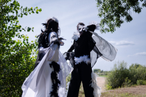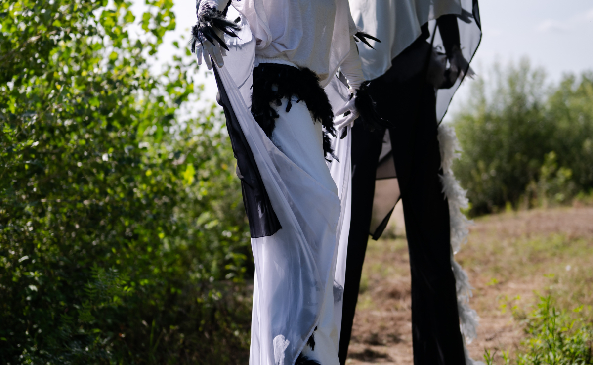 L'Envolée, ce sont deux artistes de cirque qui déambulent sur leurs échasses, dans des costumes mi humain mi oiseau, vêtus de blanc et noir, de plumes et de lumière. Ils viennent échanger avec le public un regard, un sourire, quelques mots avant de s'envoler de nouveau. Vous pourrez profiter de leur présence pour prendre quelques photos souvenirs avec eux.