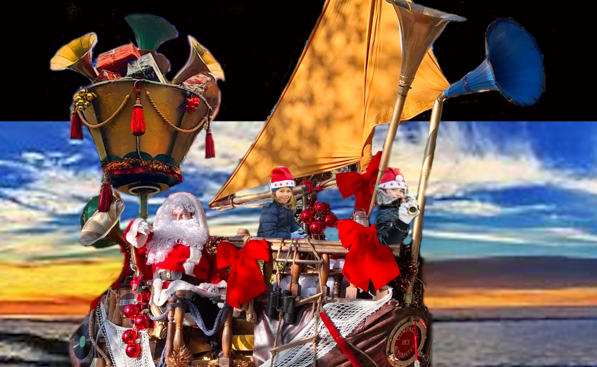 La Compagnie des automates a crée cette déambulation magique avec un Père Noël automate qui bouge la tête et les bras mais vous pouvez fournir votre vrai Père Noël. La motorisation (en plus des voiles s'il n'y a pas de vent!) est entièrement électrique et a 3h d'autonomie . Une sonorisation diffuse des chants et mélodies de Noël.