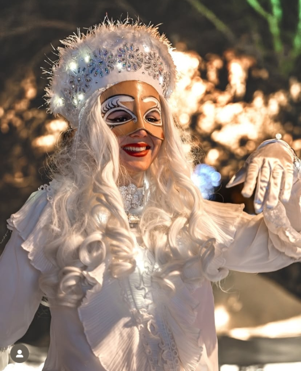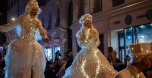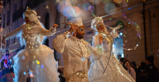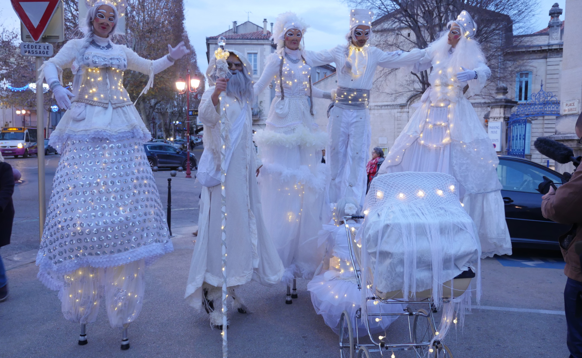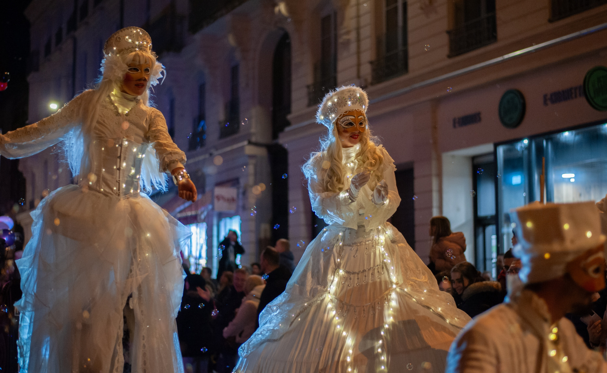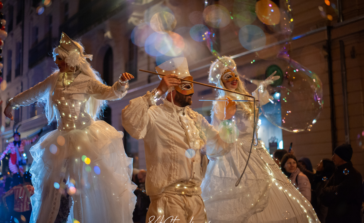 Une parade blanche et lumineuse où les poupées s’animent, la musique s’élève et la ville se transforme en décor de conte.
