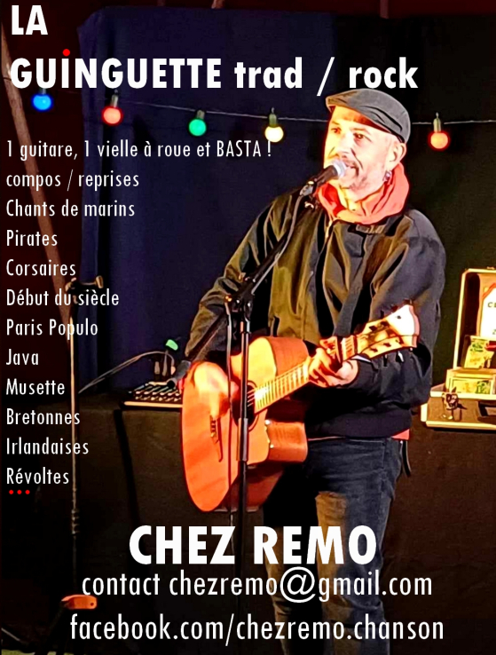 La guinguette en roue libre (chanson rock) animation concert "chanson rock" qui rajoute une couleur festive, dansante et familiale à tous vous évènements ! sans se prendre la tête, et sans la prendre au autres ! Au menu, compos et reprises, gouailles et vieilleries revisitées des différents répertoires (chansons de marins, de pirates, Bretonneries, ou Irlandaises...mais aussi Paris Populo, chant de révoltes, de lutte, sans oublier Piaf, Brassens, Renaud, Fernandel et d'autres.