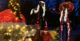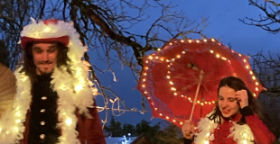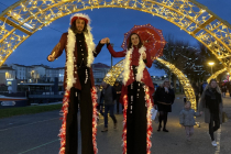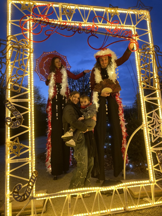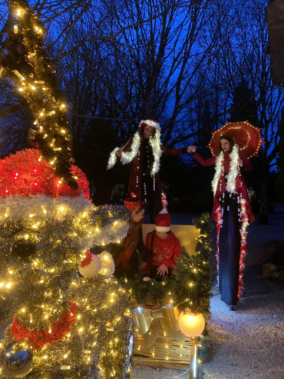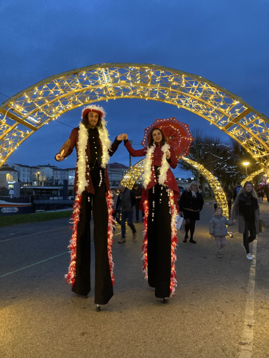 Dans les rues animées, une scène d'un autre temps se dévoile : une déambulation en échasses "la Belle Époque de Noël". Les artistes, gracieusement perchés sur leurs échasses, évoluent avec une élégance naturelle qui rappelle les salons distingués de cette période fastueuse.