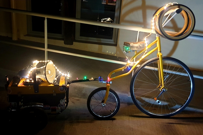 Boulon est en roue libre sur son Grand Bi sonorisé et lumineux pour Noêl.