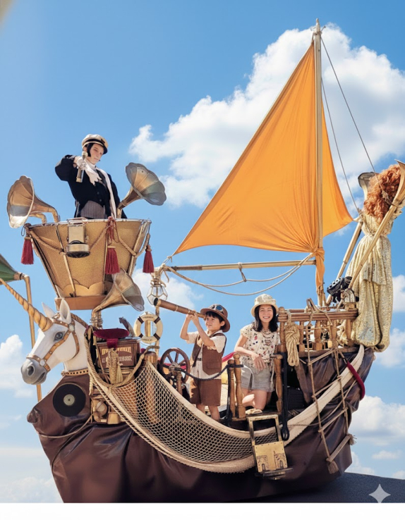Le Vaisseau déambule dans les rues les places les chemins et les espaces vert sous l'œil vigilant du capitaine Corto Maltese ou du capitaine Haddock dans la vigie. Les voiles peuvent s'adapter en hauteur selon la configuration des lieux. Les enfants sont aux commandes du gouvernail et des pompes a bras font monter l'ancre et la vigie a plus de 6 m de haut.