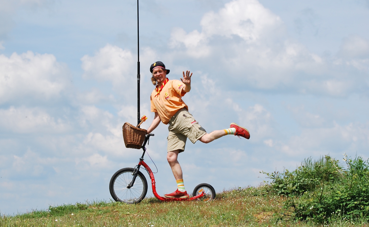 Un départ chaotique : Le personnage cherche ses complices, se parle à lui-même, essaie de jongler avec des objets improbables (roue de trottinette, ballons, torches...).