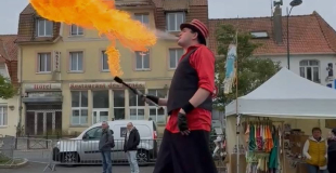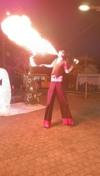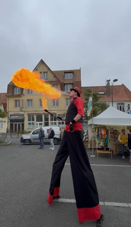 Loin d’être un simple échassier, cet artiste maîtrise le feu sous toutes ses formes avec une virtuosité impressionnante. Entre deux flammes jaillissantes, il fait tournoyer ses torches enflammées avec précision, dessinant dans l’air de véritables cercles de lumière qui hypnotisent et fascinent petits et grands. Chaque mouvement est calculé, chaque geste devient un tableau spectaculaire où l’art de la jonglerie se mêle à la magie du feu.