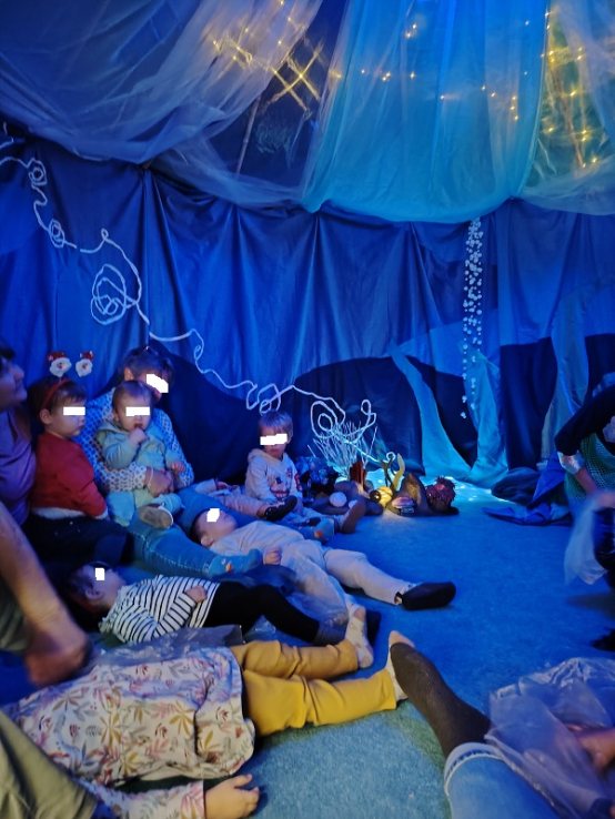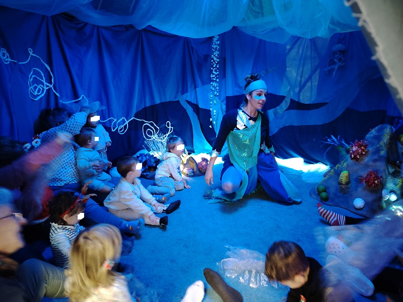 Dans cet espace sensible, résonnant avec le fond de la mer, la comédienne Pauline Layec invite les tout-petits à observer, écouter, bouger, s’exprimer, toucher et s’émerveiller. Les sens en éveil, le public explore ce lieu mystérieux et poétique.