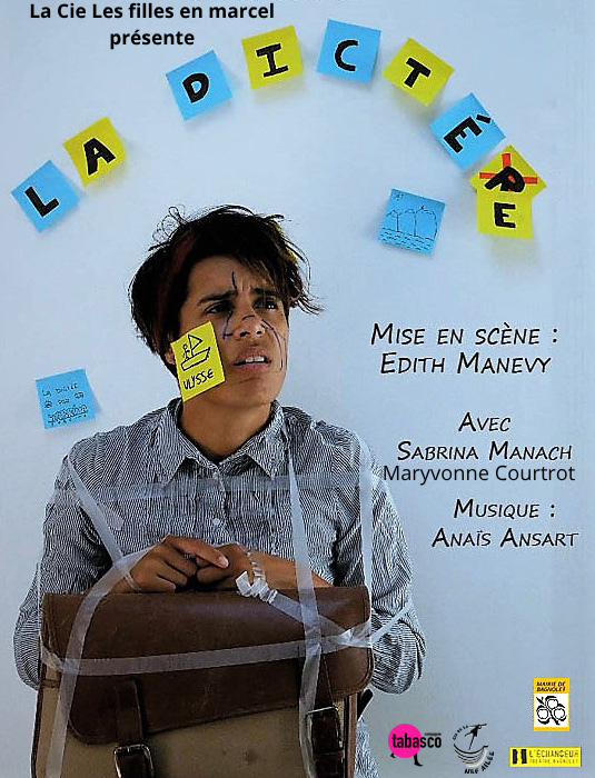 Et si une prof/ clown venez vous faire faire une dictée? Et si cette dictée était un prétexte pour s'amuser tout en apprenant? Et si cette dictée pouvait se faire dans les médiathèques? Dans les salles de classe? Dans les festivals? Et si cette proposition existait déjà! La compagnie Les filles en marcel vous propose de venir chez vous, pour vous faire faire une dictée, mais attention pas n'importe laquelle, une dictée sur le mythe d'Ulysse et Circé, on y parle de mythologie grecque donc...Mais du point de vue de Circé et de Pénélope! L'idée était de créer un espace où le public devient acteur, il fait la dictée mais de façon ludique et participative sans toutefois être dans un rapport intrusif.