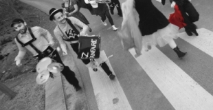 Voici venus des temps anciens les rois de la déambulation musicale !Ils arrivent par le pont et rentrent dan la ville. Sitôt sur la grand place, ils prennent la rue suivante toujours en mouvement....