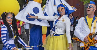 Seb CahuSébast'embull , rouge et OR , pour votre carnaval, Echassier du haut de ses 3 metres , avec ses enormes cuves a confetti's (5kg), derriere une bandas un orchestre de rue , il danse , bouge ,... |