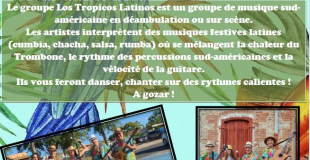 Los Tropicos latinos est un groupe de musique sud-américaine en déambulation ou en concert. Les artistes musiciens-chanteurs interprètent des musiques festives latines (cumbia, chacha, salsa,...