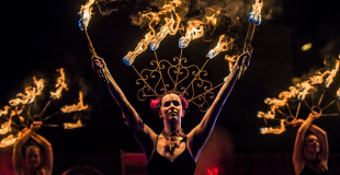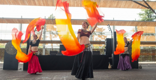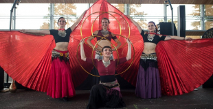 Spectacle dynamique et coloré alliant danse du monde et jonglerie moderne.Les danseuses en costumes somptueux manipulent une ribambelle d'objets : hula hoop, éventails de soie, ailes d'Isis, bolas...